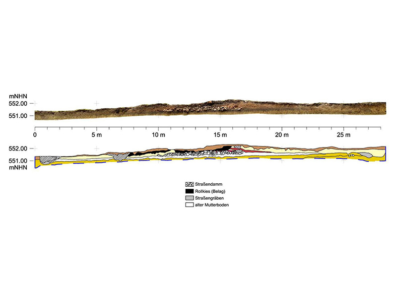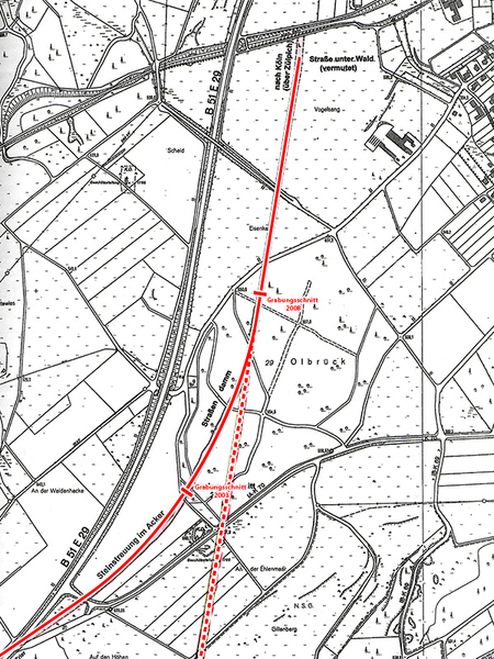 In einem Probeschnitt auf der Nordseite des Olbrückwaldes wurde die Trasse in ihrer vollen Breite von 25 Metern erfasst. Auf beiden Seiten des Straßendamms wurden die jeweils zehn Meter breiten Sommerwege, die in der trockenen Jahreszeit für Fußgänger, Pferde und Vieh bestimmt waren, und die beiden Straßengräben freigelegt.