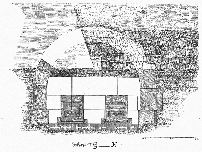 Der Boden der Kammer ist mit vulkanischen Tuffsteinquadern ausgelegt. Im unteren Bereich bestehen die Wände aus unterschiedlich großen, roten Buntsandsteinblöcken. Es handelt sich dabei um Spolien, also wiederverwendete Steine aus einem älteren Bauwerk. Auf dem Sockel setzt das aus Tuff errichtete Gewölbe auf, das etwa 3,25 Meter hoch gewesen sein muss. Der Deckenbereich ist nicht erhalten. Wie das Gebäude über der Erde aussah, bleibt daher unbekannt.