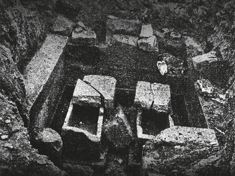 In die Grabkammer führte ein Gang, dessen nördliche Wand gut erhalten ist. Verschlossen wurde die Kammer durch eine Tür, die wahrscheinlich aus Holz bestand. Am Ende der nördlichen Zugangswand sind die Türwange und ein Loch für den Türriegel gut zu erkennen. Die Sarkophage sind breiter als der Zugang – sie müssen daher schon während des Baus in die noch offene Kammer eingelassen worden sein.