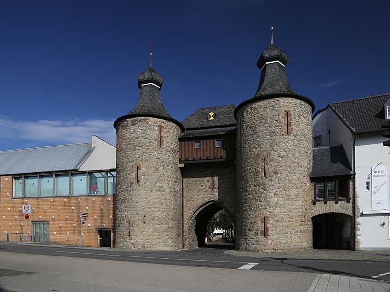 Wahrzeichen auf römischem Grund: Der Hexenturm, ursprünglich das „Rurtor“, ist das letzte verbliebene von ursprünglich vier Stadttoren der mittelalterlichen Jülicher Stadtmauer. Seit römischer Zeit endete die Siedlung hier auf Höhe des Tores; tiefer gelegene Bereiche wären bei Hochwasser der Rur überflutet worden.