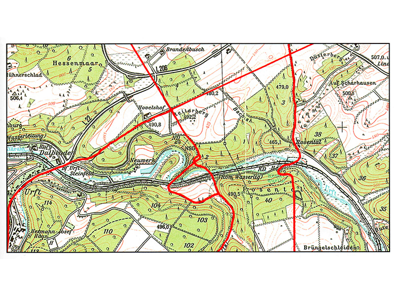 Bergauf, bergab und mehrfach verschlungen: Zwischen Kall-Keldenich und Marmagen teilte sich die bis dahin so schnurgerade Agrippastraße in zwei Stränge auf. Sie trennten sich auf der Nordseite des tief eingeschnittenen Urfttales und führten auf verschiedenen Wegen zum Fluss hinab. Die östliche Variante bog nach der Gabelung fast rechtwinklig ab und führte schräg am Hang hinab, mit einem Gefälle von mehr als 20 Prozent. Um diese Strecke überhaupt zu ermöglichen, musste der Fels fast fünf Meter tief eingeschnitten werden – eine schwere und langwierige Arbeit.