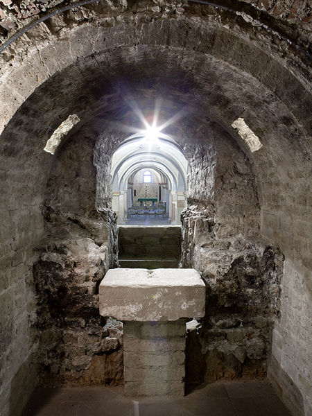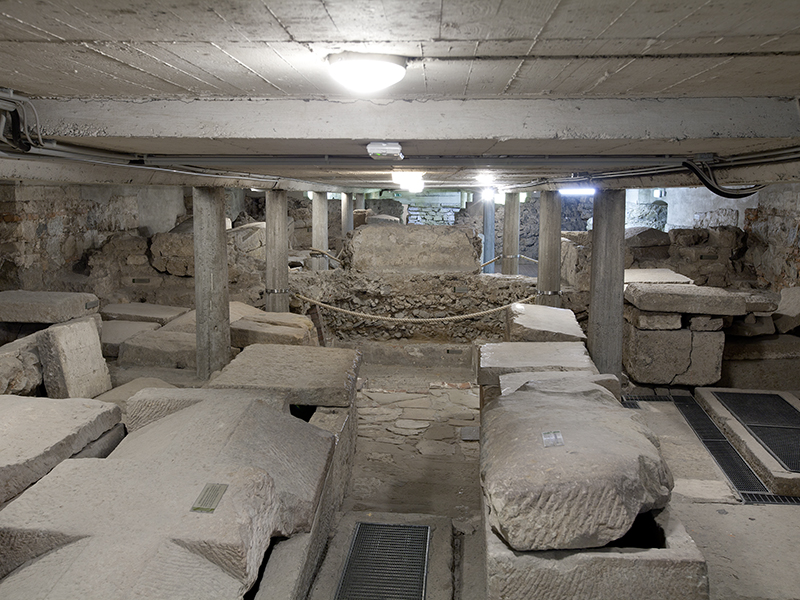 Das konservierte Grabungsgelände unter der Kirche ist Teil des großen südlichen Friedhofs zu beiden Seiten der Römerstraße. Es vermittelt ein eindrucksvolles Bild der Bestattungsformen in römischer und fränkischer Zeit. Gräber, Sarkophage und Grabbauten sind hier an ihrem ursprünglichen Ort zu besichtigen.
