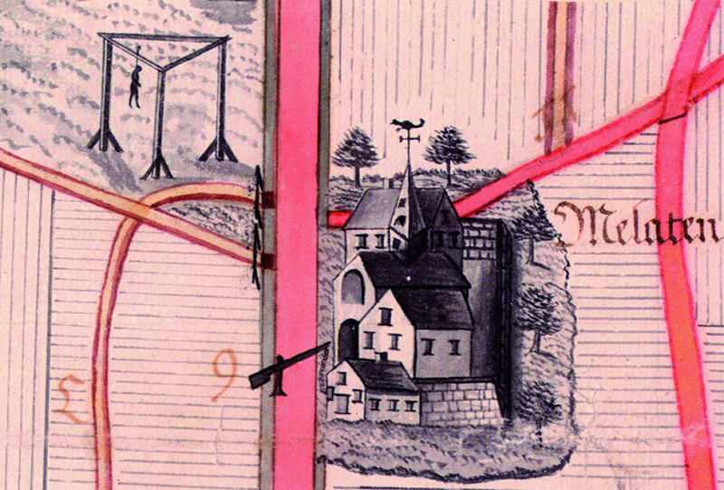 Schräg gegenüber, an einer Straßengabelung, befand sich eine öffentliche Hinrichtungsstätte, der „Rabenstein“. 1529 wurden dort die beiden evangelischen Märtyrer Peter Fliesteden und Adolf Clarenbach wegen ihres Bekenntnisses zu Martin Luther als Ketzer hingerichtet. Als Hexen verurteilte Frauen und Mädchen wurden dort zu Beginn des 17. Jahrhunderts verbrannt. Die letzte Hinrichtung fand 1797 statt: Eine große Menschenmenge versammelte sich zur Hinrichtung des Kirchenräubers Peter Eick am Galgen.
