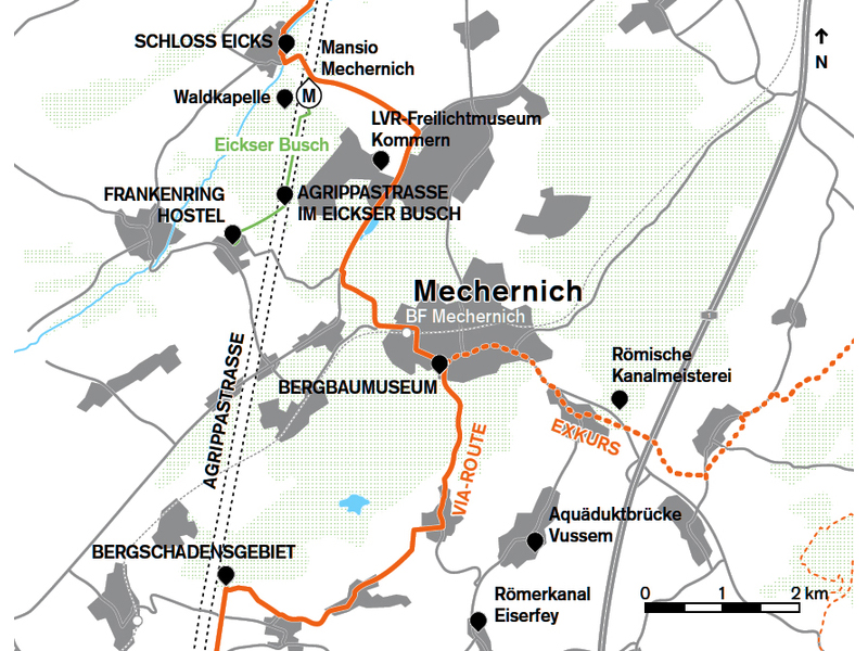 Im Norden Mechernichs beginnt die Route des Erlebnisraums Römerstraße an der früheren Agrippastraße. Spaziergänger können den historischen Straßenverlauf von hier aus im Eickser Busch nachvollziehen. Wer lieber in die Pedale tritt, kann asphaltierte Radwege nutzen. Große Höhenunterschiede im Stadtgebiet führen zu teils anspruchsvollen Steigungen – und wunderschönen Ausblicken, die für jede Anstrengung entschädigen