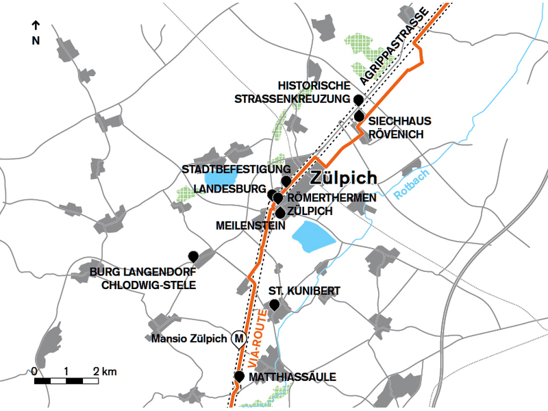 Schnurgerade Straßen, die zur Stadt hinein- und wieder herausführen, verraten bis heute, dass Zülpich ein wichtiger Kreuzungspunkt gleich mehrerer römischer Fernstraßen war. Doch nicht nur das: Zahlreiche archäologische Fundstellen lassen auf eine römische Siedlung schließen, in deren Blütezeit im zweiten Jahrhundert eine weitläufige Thermenanlage entstand.