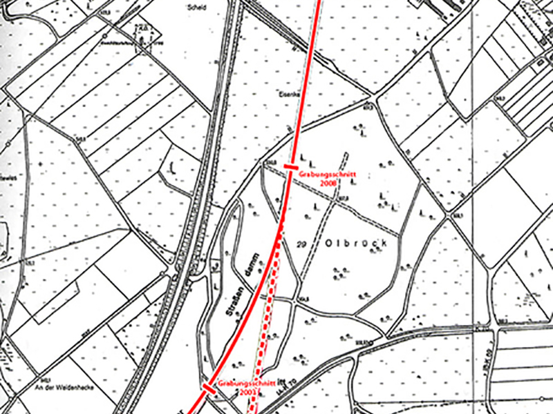 In einem Probeschnitt auf der Nordseite des Olbrückwaldes wurde die Trasse in ihrer vollen Breite von 25 Metern erfasst. Auf beiden Seiten des Straßendamms wurden die jeweils zehn Meter breiten Sommerwege, die in der trockenen Jahreszeit für Fußgänger, Pferde und Vieh bestimmt waren, und die beiden Straßengräben freigelegt.