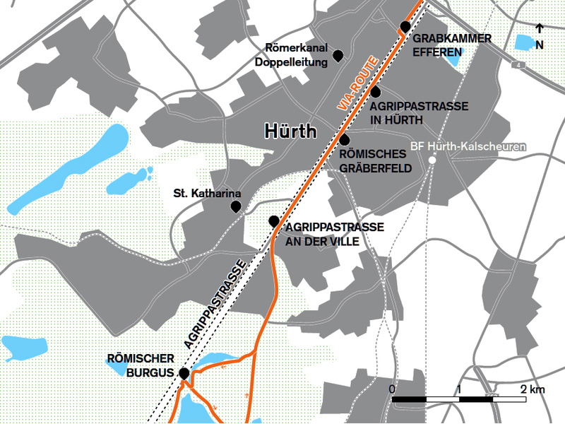 Die Routenführung des Erlebnisraums Römerstraße verläuft von Köln aus fast vollständig und gut ausgebaut entlang der ehemaligen Agrippastraße, an der bei Bauarbeiten immer wieder Römergräber entdeckt werden – wie zum Beispiel die aus roten Sandsteinquadern errichtete Grabkammer im Stadtteil Efferen. Sie gilt als eine der bedeutendsten römischen Grabanlagen Deutschlands und kann besichtigt werden.