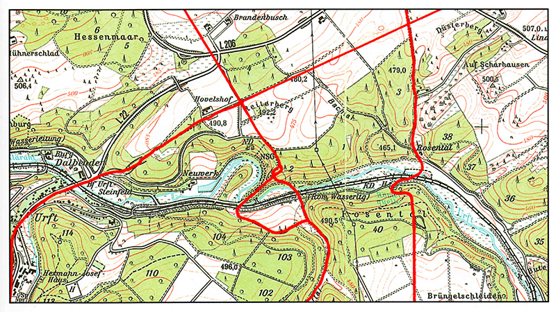 Bergauf, bergab und mehrfach verschlungen: Zwischen Kall-Keldenich und Marmagen teilte sich die bis dahin so schnurgerade Agrippastraße in zwei Stränge auf. Sie trennten sich auf der Nordseite des tief eingeschnittenen Urfttales und führten auf verschiedenen Wegen zum Fluss hinab. Die östliche Variante bog nach der Gabelung fast rechtwinklig ab und führte schräg am Hang hinab, mit einem Gefälle von mehr als 20 Prozent. Um diese Strecke überhaupt zu ermöglichen, musste der Fels fast fünf Meter tief eingeschnitten werden – eine schwere und langwierige Arbeit.
