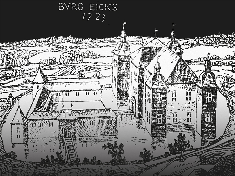 Vom Gutshof zur barocken Pracht: Kaum ein anderer Adelssitz im Rheinland ist so authentisch erhalten wie Burg Eicks. Heute zeigt sich das Anwesen als Barockschloss, das dem ursprünglichen Herrenhof folgte. Dieser war dort bereits seit Anfang des 14. Jahrhunderts zu finden. 1690 mit mittelalterlichen Baumaterialien errichtet, ist Schloss Eicks ein Standardtyp des rheinischen Adelssitzes mit einer zweiteiligen Wasserburg, einer Vorburg mit Türmen und einem Herrenhaus.