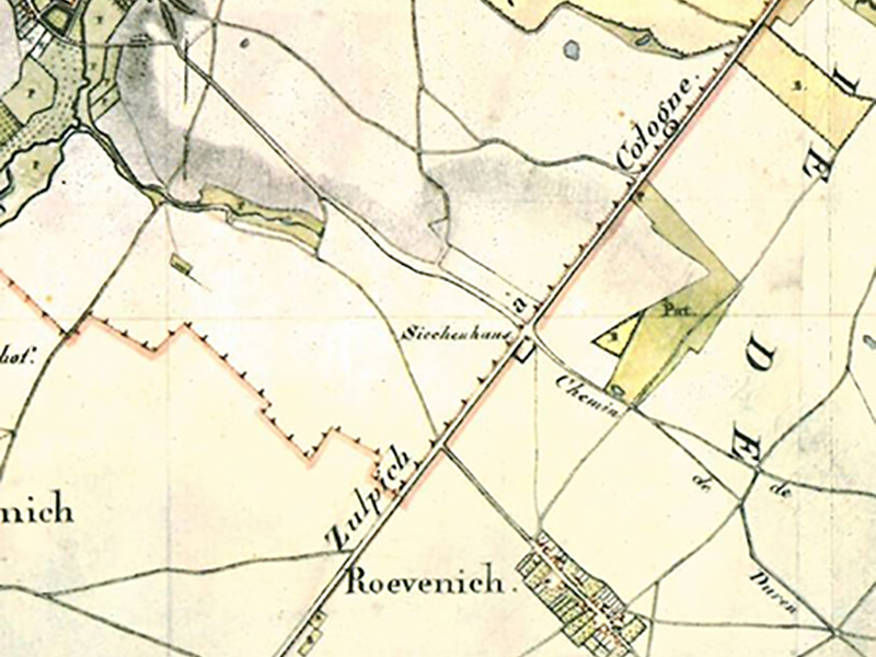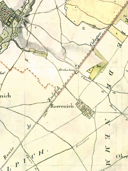 Der Wirtschaftsweg, der heute aus Richtung Sievernich am Siechhaus vorbeiführt, lässt nicht mehr erkennen, dass hier einmal die Aachen-Frankfurter Heerstraße verlief. Deren Alter kann dabei bis in karolingische Zeit zurückverfolgt werden. Archäologen gehen jedoch davon aus, dass sie einen römischen Vorläufer gehabt hat. Im Mittelalter diente sie nicht nur als Heerstraße – sie war darüber hinaus Handels-, Pilger- und Postweg.